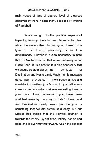 Before we go into the practical aspects of imparting training, there is need for us to be clear about the system itself. Is our system based on a type of evolutionary philosophy or is it a devolutionary. Further it is also necessary to note that our Master asserted that we are returning to our Home Land. In this context it is also necessary that we should be clear about the concepts of Destination and Home Land. Master in his message dated May 1970 stated ―... if we pause a little and consider the problem (the Destination) we will surely come to the conclusion that you are sailing towards your own Home, wherefrom you have been snatched away by the irony of Fate.‖ Home Land and Destination clearly mean that the goal is something that we are aware of already. But our Master has stated that the spiritual journey is towards the Infinity. By definition, Infinity, has no end point and is ever moving forward. Again the concept