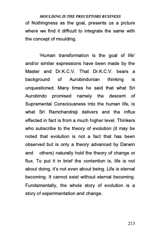 ̳Human transformation is the goal of life‘ and/or similar expressions have been made by the Master and Dr.K.C.V. That Dr.K.C.V. bears a background of Aurobindonian thinking is unquestioned. Many times he said that what Sri Aurobindo promised namely the descent of Supramental Consciousness into the human life, is what Sri Ramchandraji delivers and the influx effected in fact is from a much higher level. Thinkers who subscribe to the theory of evolution (it may be noted that evolution is not a fact that has been observed but is only a theory advanced by Darwin and others) naturally hold the theory of change or flux. To put it in brief the contention is, life is not about doing, it‘s not even about being. Life is eternal becoming. It cannot exist without eternal becoming. Fundamentally, the whole story of evolution is a story of experimentation and change.