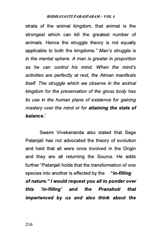 strata of the animal kingdom, that animal is the strongest which can kill the greatest number of animals. Hence the struggle theory is not equally applicable to both the kingdoms.” Man’s struggle is in the mental sphere. A man is greater in proportion as he can control his mind. When the mind’s activities are perfectly at rest, the Atman manifests itself. The struggle which we observe in the animal kingdom for the preservation of the gross body has its use in the human plane of existence for gaining mastery over the mind or for attaining the state of balance.’