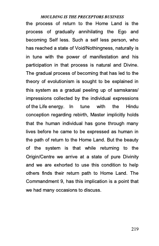 the process of return to the Home Land is the process of gradually annihilating the Ego and becoming Self less. Such a self less person, who has reached a state of Void/Nothingness, naturally is in tune with the power of manifestation and his participation in that process is natural and Divine. The gradual process of becoming that has led to the theory of evolutionism is sought to be explained in this system as a gradual peeling up of samskaras/ impressions collected by the individual expressions of the Life energy. In tune with the Hindu conception regarding rebirth, Master implicitly holds that the human individual has gone through many lives before he came to be expressed as human in the path of return to the Home Land. But the beauty of the system is that while returning to the Origin/Centre we arrive at a state of pure Divinity and we are exhorted to use this condition to help others finds their return path to Home Land. The Commandment 9, has this implication is a point that we had many occasions to discuss.