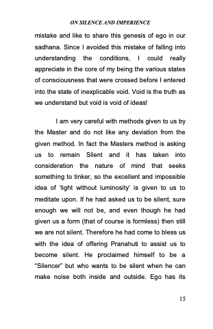 I am very careful with methods given to us by the Master and do not like any deviation from the given method. In fact the Masters method is asking us to remain Silent and it has taken into consideration the nature of mind that seeks something to tinker, so the excellent and impossible idea of ̳light without luminosity‘ is given to us to meditate upon. If he had asked us to be silent, sure enough we will not be, and even though he had given us a form (that of course is formless) then still we are not silent. Therefore he had come to bless us with the idea of offering Pranahuti to assist us to become silent. He proclaimed himself to be a ―Silencer‖ but who wants to be silent when he can make noise both inside and outside. Ego has its