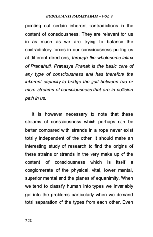 pointing out certain inherent contradictions in the content of consciousness. They are relevant for us in as much as we are trying to balance the contradictory forces in our consciousness pulling us at different directions, through the wholesome influx of Pranahuti. Pranasya Pranah is the basic core of any type of consciousness and has therefore the inherent capacity to bridge the gulf between two or more streams of consciousness that are in collision path in us.