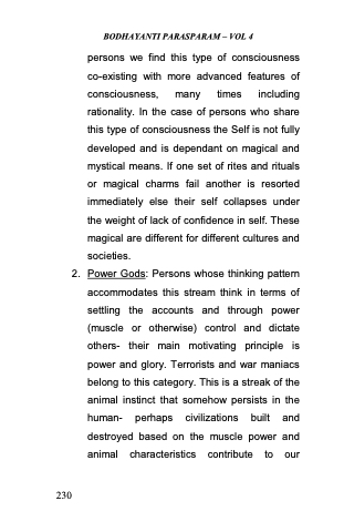 persons we find this type of consciousness co-existing with more advanced features of consciousness, many times including rationality. In the case of persons who share this type of consciousness the Self is not fully developed and is dependant on magical and mystical means. If one set of rites and rituals or magical charms fail another is resorted immediately else their self collapses under the weight of lack of confidence in self. These magical are different for different cultures and societies.