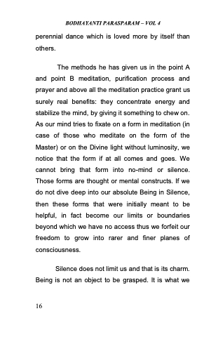 The methods he has given us in the point A and point B meditation, purification process and prayer and above all the meditation practice grant us surely real benefits: they concentrate energy and stabilize the mind, by giving it something to chew on. As our mind tries to fixate on a form in meditation (in case of those who meditate on the form of the Master) or on the Divine light without luminosity, we notice that the form if at all comes and goes. We cannot bring that form into no-mind or silence. Those forms are thought or mental constructs. If we do not dive deep into our absolute Being in Silence, then these forms that were initially meant to be helpful, in fact become our limits or boundaries beyond which we have no access thus we forfeit our freedom to grow into rarer and finer planes of consciousness.