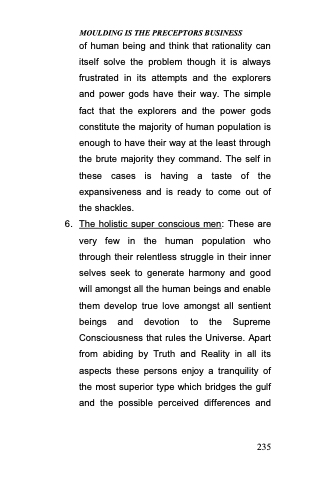 6. The holistic super conscious men: These are very few in the human population who through their relentless struggle in their inner selves seek to generate harmony and good will amongst all the human beings and enable them develop true love amongst all sentient beings and devotion to the Supreme Consciousness that rules the Universe. Apart from abiding by Truth and Reality in all its aspects these persons enjoy a tranquility of the most superior type which bridges the gulf and the possible perceived differences and