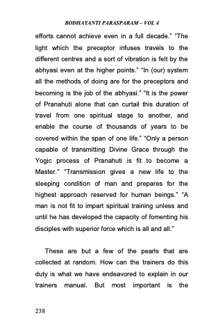 efforts cannot achieve even in a full decade.‖ ―The light which the preceptor infuses travels to the different centres and a sort of vibration is felt by the abhyasi even at the higher points.‖ ―In (our) system all the methods of doing are for the preceptors and becoming is the job of the abhyasi.‖ ―It is the power of Pranahuti alone that can curtail this duration of travel from one spiritual stage to another, and enable the course of thousands of years to be covered within the span of one life.‖ ―Only a person capable of transmitting Divine Grace through the Yogic process of Pranahuti is fit to become a Master.‖ ―Transmission gives a new life to the sleeping condition of man and prepares for the highest approach reserved for human beings.‖ ―A man is not fit to impart spiritual training unless and until he has developed the capacity of fomenting his disciples with superior force which is all and all.‖