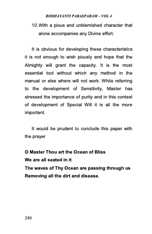 It is obvious for developing these characteristics it is not enough to wish piously and hope that the Almighty will grant the capacity. It is the most essential tool without which any method in the manual or else where will not work. While referring to the development of Sensitivity, Master has stressed the importance of purity and in this context of development of Special Will it is all the more important.