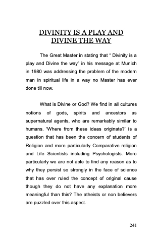 The Great Master in stating that ― Divinity is a play and Divine the way‖ in his message at Munich in 1980 was addressing the problem of the modern man in spiritual life in a way no Master has ever done till now.