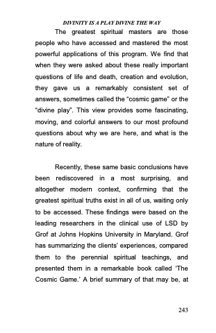 Recently, these same basic conclusions have been rediscovered in a most surprising, and altogether modern context, confirming that the greatest spiritual truths exist in all of us, waiting only to be accessed. These findings were based on the leading researchers in the clinical use of LSD by Grof at Johns Hopkins University in Maryland. Grof has summarizing the clients‘ experiences, compared them to the perennial spiritual teachings, and presented them in a remarkable book called ̳The Cosmic Game.‘ A brief summary of that may be, at
