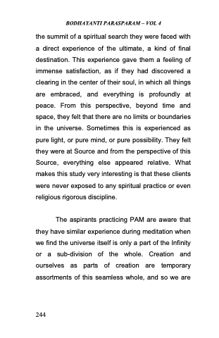 the summit of a spiritual search they were faced with a direct experience of the ultimate, a kind of final destination. This experience gave them a feeling of immense satisfaction, as if they had discovered a clearing in the center of their soul, in which all things are embraced, and everything is profoundly at peace. From this perspective, beyond time and space, they felt that there are no limits or boundaries in the universe. Sometimes this is experienced as pure light, or pure mind, or pure possibility. They felt they were at Source and from the perspective of this Source, everything else appeared relative. What makes this study very interesting is that these clients were never exposed to any spiritual practice or even religious rigorous discipline.