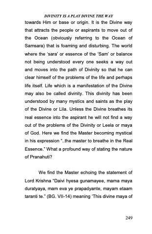 towards Him or base or origin. It is the Divine way that attracts the people or aspirants to move out of the Ocean (obviously referring to the Ocean of Samsara) that is foaming and disturbing. The world where the ̳sara‘ or essence of the ̳Sam‘ or balance not being understood every one seeks a way out and moves into the path of Divinity so that he can clear himself of the problems of the life and perhaps life itself. Life which is a manifestation of the Divine may also be called divinity. This divinity has been understood by many mystics and saints as the play of the Divine or Lila. Unless the Divine breathes its real essence into the aspirant he will not find a way out of the problems of the Divinity or Leela or maya of God. Here we find the Master becoming mystical in his expression ―..the master to breathe in the Real Essence.‖ What a profound way of stating the nature of Pranahuti?