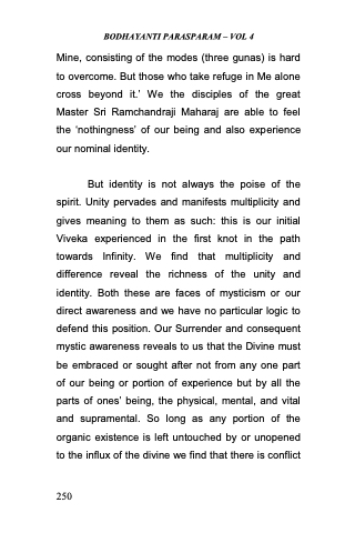 But identity is not always the poise of the spirit. Unity pervades and manifests multiplicity and gives meaning to them as such: this is our initial Viveka experienced in the first knot in the path towards Infinity. We find that multiplicity and difference reveal the richness of the unity and identity. Both these are faces of mysticism or our direct awareness and we have no particular logic to defend this position. Our Surrender and consequent mystic awareness reveals to us that the Divine must be embraced or sought after not from any one part of our being or portion of experience but by all the parts of ones‘ being, the physical, mental, and vital and supramental. So long as any portion of the organic existence is left untouched by or unopened to the influx of the divine we find that there is conflict