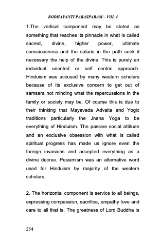 1.The vertical component may be stated as something that reaches its pinnacle in what is called sacred, divine, higher power, ultimate consciousness and the safaris in the path seek if necessary the help of the divine. This is purely an individual oriented or self centric approach. Hinduism was accused by many western scholars because of its exclusive concern to get out of samsara not minding what the repercussions in the family or society may be. Of course this is due to their thinking that Mayavada Advaita and Yogic traditions particularly the Jnana Yoga to be everything of Hinduism. The passive social attitude and an exclusive obsession with what is called spiritual progress has made us ignore even the foreign invasions and accepted everything as a divine decree. Pessimism was an alternative word used for Hinduism by majority of the western scholars.