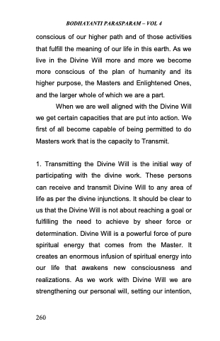1. Transmitting the Divine Will is the initial way of participating with the divine work. These persons can receive and transmit Divine Will to any area of life as per the divine injunctions. It should be clear to us that the Divine Will is not about reaching a goal or fulfilling the need to achieve by sheer force or determination. Divine Will is a powerful force of pure spiritual energy that comes from the Master. It creates an enormous infusion of spiritual energy into our life that awakens new consciousness and realizations. As we work with Divine Will we are strengthening our personal will, setting our intention,