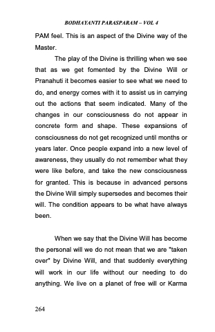 The play of the Divine is thrilling when we see that as we get fomented by the Divine Will or Pranahuti it becomes easier to see what we need to do, and energy comes with it to assist us in carrying out the actions that seem indicated. Many of the changes in our consciousness do not appear in concrete form and shape. These expansions of consciousness do not get recognized until months or years later. Once people expand into a new level of awareness, they usually do not remember what they were like before, and take the new consciousness for granted. This is because in advanced persons the Divine Will simply supersedes and becomes their will. The condition appears to be what have always been.