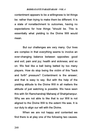 But our challenges are very many. Our lives are complex in that everything seems to involve an ever-changing balance between opposites: good and evil; pain and joy; health and sickness; and so on. We feel like a ball being batted by too many players. How do stop being the victim of this "back and forth" pressure? Contentment is the answer; and that is easy to say. But with the help of the yielding attitude to the Divine Will in all matters the attitude of just watching is possible. We have seen this with Sri Ramchandraji Maharaj of Shahjahanpur. Why we are not able to like that is our Will is not aligned to the Divine Will to the extent His was. It is our duty to align our will with the Divine.