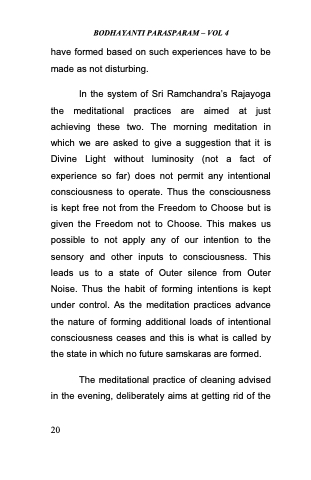 In the system of Sri Ramchandra‘s Rajayoga the meditational practices are aimed at just achieving these two. The morning meditation in which we are asked to give a suggestion that it is Divine Light without luminosity (not a fact of experience so far) does not permit any intentional consciousness to operate. Thus the consciousness is kept free not from the Freedom to Choose but is given the Freedom not to Choose. This makes us possible to not apply any of our intention to the sensory and other inputs to consciousness. This leads us to a state of Outer silence from Outer Noise. Thus the habit of forming intentions is kept under control. As the meditation practices advance the nature of forming additional loads of intentional consciousness ceases and this is what is called by the state in which no future samskaras are formed.