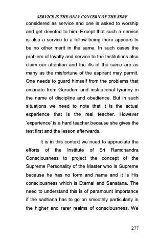 considered as service and one is asked to worship and get devoted to him. Except that such a service is also a service to a fellow being there appears to be no other merit in the same. In such cases the problem of loyalty and service to the Institutions also claim our attention and the ills of the same are as many as the misfortune of the aspirant may permit. One needs to guard himself from the problems that emanate from Gurudom and institutional tyranny in the name of discipline and obedience. But in such situations we need to note that it is the actual experience that is the real teacher. However ̳experience‘ is a hard teacher because she gives the test first and the lesson afterwards.