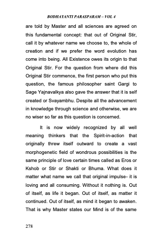 It is now widely recognized by all well meaning thinkers that the Spirit-in-action that originally threw itself outward to create a vast morphogenetic field of wondrous possibilities is the same principle of love certain times called as Eros or Kshob or Stir or Shakti or Bhuma. What does it matter what name we call that original impulse- it is loving and all consuming. Without it nothing is. Out of itself, as life it began. Out of itself, as matter it continued. Out of itself, as mind it began to awaken. That is why Master states our Mind is of the same