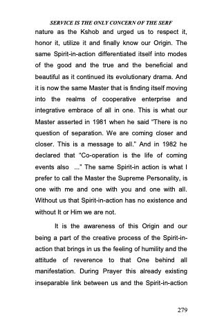 nature as the Kshob and urged us to respect it, honor it, utilize it and finally know our Origin. The same Spirit-in-action differentiated itself into modes of the good and the true and the beneficial and beautiful as it continued its evolutionary drama. And it is now the same Master that is finding itself moving into the realms of cooperative enterprise and integrative embrace of all in one. This is what our Master asserted in 1981 when he said ―There is no question of separation. We are coming closer and closer. This is a message to all.‖ And in 1982 he declared that ―Co-operation is the life of coming events also ...‖ The same Spirit-in action is what I prefer to call the Master the Supreme Personality, is one with me and one with you and one with all. Without us that Spirit-in-action has no existence and without It or Him we are not.