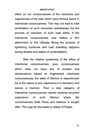 effect on our consciousness of the memories and experiences of the past which have formed layers in intentional consciousness. This may not lead to total annihilation of such memories (samskaras) but the process of reduction of such load starts. If the intentional consciousness now makes a firm attachment to the Ultimate Being the process of lightening continues and load shedding happens during dreams and states of contemplation.