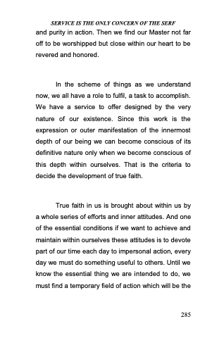 True faith in us is brought about within us by a whole series of efforts and inner attitudes. And one of the essential conditions if we want to achieve and maintain within ourselves these attitudes is to devote part of our time each day to impersonal action, every day we must do something useful to others. Until we know the essential thing we are intended to do, we must find a temporary field of action which will be the
