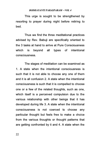 Thus we find the three meditational practices advised by Rev. Babuji are specifically oriented to the 3 tasks at hand to arrive at Pure Consciousness which is beyond all types of intentional consciousness.