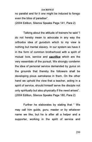 Talking about the attitude of trainers he said ―I do not hereby mean to advocate in any way the orthodox idea of gurudom which to my view is nothing but mental slavery. In our system we have it in the form of common brotherhood with a spirit of mutual love, service and sacrifice which are the very essentials of the pursuit. We strongly condemn the idea of personal service demanded by gurus on the grounds that thereby the followers shall be developing pious samskaras in them. On the other hand we uphold the view that a teacher, acting in a spirit of service, should himself serve the disciple not only spiritually but also physically if the need arises‖. (2004 Edition, Silence Speaks Page 180, Para 2)