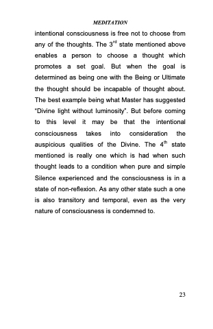 intentional consciousness is free not to choose from any of the thoughts. The 3rd state mentioned above enables a person to choose a thought which promotes a set goal. But when the goal is determined as being one with the Being or Ultimate the thought should be incapable of thought about. The best example being what Master has suggested ―Divine light without luminosity‖. But before coming to this level it may be that the intentional consciousness takes into consideration the auspicious qualities of the Divine. The 4th state mentioned is really one which is had when such thought leads to a condition when pure and simple Silence experienced and the consciousness is in a state of non-reflexion. As any other state such a one is also transitory and temporal, even as the very nature of consciousness is condemned to.