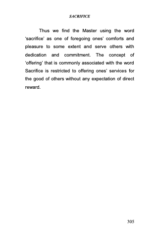 Thus we find the Master using the word ̳sacrifice‘ as one of foregoing ones‘ comforts and pleasure to some extent and serve others with dedication and commitment. The concept of ̳offering‘ that is commonly associated with the word Sacrifice is restricted to offering ones‘ services for the good of others without any expectation of direct reward.