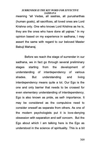 Before we reach the stage of surrender in our sadhana, we in fact go through several preliminary stages starting from the development of understanding of interdependency of various shades. But understanding and living interdependency means quite a lot. Our Ego is the one and only barrier that needs to be crossed for even elementary understanding of interdependency. Ego is also known as pride, as self- importance. It may be considered as the compulsive need to consider oneself as separate from others. As one of the modern psychologists put it is love-denying obsession with separation and self concern. But the Ego about which I am talking here is the Ego as understood in the science of spirituality. This is a bit