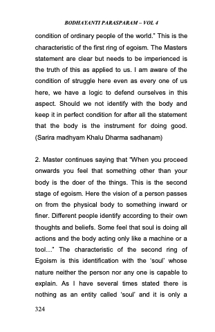 condition of ordinary people of the world.‖ This is the characteristic of the first ring of egoism. The Masters statement are clear but needs to be imperienced is the truth of this as applied to us. I am aware of the condition of struggle here even as every one of us here, we have a logic to defend ourselves in this aspect. Should we not identify with the body and keep it in perfect condition for after all the statement that the body is the instrument for doing good. (Sarira madhyam Khalu Dharma sadhanam)