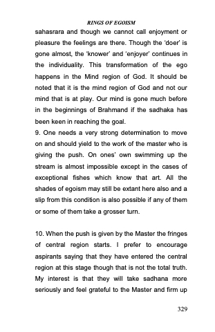 9. One needs a very strong determination to move on and should yield to the work of the master who is giving the push. On ones‘ own swimming up the stream is almost impossible except in the cases of exceptional fishes which know that art. All the shades of egoism may still be extant here also and a slip from this condition is also possible if any of them or some of them take a grosser turn.