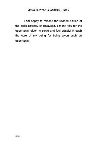 BODHAYANTI PARASPARAM – VOL 4 I am happy to release the revised edition of the book Efficacy of Rajayoga. I thank you for the opportunity given to serve and feel grateful through the core of my being for being given such an opportunity. 332