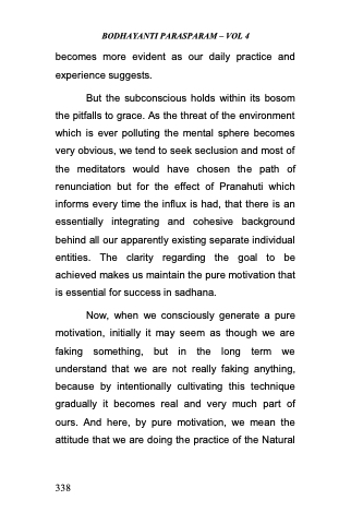 But the subconscious holds within its bosom the pitfalls to grace. As the threat of the environment which is ever polluting the mental sphere becomes very obvious, we tend to seek seclusion and most of the meditators would have chosen the path of renunciation but for the effect of Pranahuti which informs every time the influx is had, that there is an essentially integrating and cohesive background behind all our apparently existing separate individual entities. The clarity regarding the goal to be achieved makes us maintain the pure motivation that is essential for success in sadhana.
