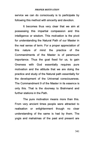 It becomes thus very clear that we aim at possessing this impartial compassion and this intelligence or wisdom. This motivation is the pivot for understanding the Natural Path of our Master in the real sense of term. For a proper appreciation of this nature of mind the practice of the Commandments of the Master is of paramount importance. Thus the goal fixed for us, to gain Oneness with God essentially requires pure motivation and the attitude that we are doing the practice and study of the Natural path essentially for the development of the Universal consciousness. The Commandment 9 of the Master in its essence is only this. That is the doorway to Brahmand and further stations in the Path.