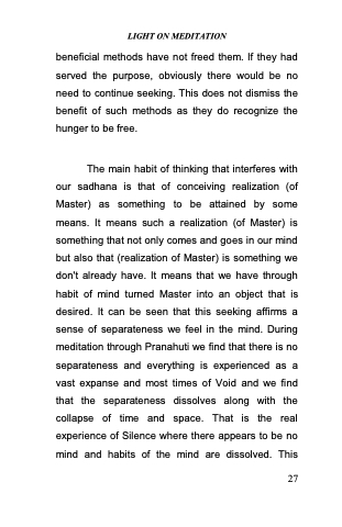 The main habit of thinking that interferes with our sadhana is that of conceiving realization (of Master) as something to be attained by some means. It means such a realization (of Master) is something that not only comes and goes in our mind but also that (realization of Master) is something we don't already have. It means that we have through habit of mind turned Master into an object that is desired. It can be seen that this seeking affirms a sense of separateness we feel in the mind. During meditation through Pranahuti we find that there is no separateness and everything is experienced as a vast expanse and most times of Void and we find that the separateness dissolves along with the collapse of time and space. That is the real experience of Silence where there appears to be no mind and habits of the mind are dissolved. This