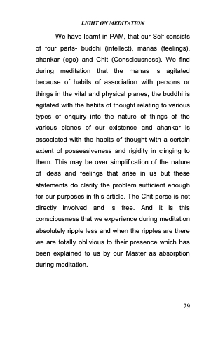 We have learnt in PAM, that our Self consists of four parts- buddhi (intellect), manas (feelings), ahankar (ego) and Chit (Consciousness). We find during meditation that the manas is agitated because of habits of association with persons or things in the vital and physical planes, the buddhi is agitated with the habits of thought relating to various types of enquiry into the nature of things of the various planes of our existence and ahankar is associated with the habits of thought with a certain extent of possessiveness and rigidity in clinging to them. This may be over simplification of the nature of ideas and feelings that arise in us but these statements do clarify the problem sufficient enough for our purposes in this article. The Chit perse is not directly involved and is free. And it is this consciousness that we experience during meditation absolutely ripple less and when the ripples are there we are totally oblivious to their presence which has been explained to us by our Master as absorption during meditation.