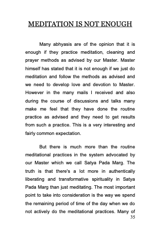 But there is much more than the routine meditational practices in the system advocated by our Master which we call Satya Pada Marg. The truth is that there's a lot more in authentically liberating and transformative spirituality in Satya Pada Marg than just meditating. The most important point to take into consideration is the way we spend the remaining period of time of the day when we do