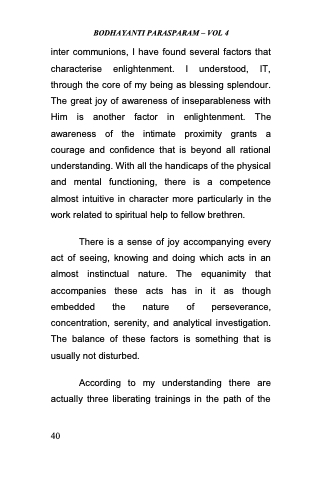 inter communions, I have found several factors that characterise enlightenment. I understood, IT, through the core of my being as blessing splendour. The great joy of awareness of inseparableness with Him is another factor in enlightenment. The awareness of the intimate proximity grants a courage and confidence that is beyond all rational understanding. With all the handicaps of the physical and mental functioning, there is a competence almost intuitive in character more particularly in the work related to spiritual help to fellow brethren.