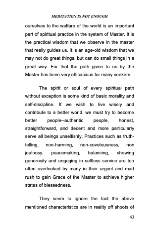The spirit or soul of every spiritual path without exception is some kind of basic morality and self-discipline. If we wish to live wisely and contribute to a better world, we must try to become better people--authentic people, honest, straightforward, and decent and more particularly serve all beings unselfishly. Practices such as truth- telling, non-harming, non-covetousness, non jealousy, peacemaking, balancing, showing generosity and engaging in selfless service are too often overlooked by many in their urgent and mad rush to gain Grace of the Master to achieve higher states of blessedness.