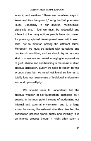 worship and awaken. ―There are countless ways to kneel and kiss the ground,‖ sang the Sufi poet-saint Rumi. Especially in our diverse, multicultural, pluralistic era, I feel we must be respectful and tolerant of the many options people have discovered for pursuing spiritual development, even within each faith, not to mention among the different faiths. Moreover, we must be patient with ourselves and our karmic condition, and we should try to be more kind to ourselves and avoid indulging in expressions of guilt, shame and self-bashing in the name of deep spiritual aspiration. Surely we need to repent for the wrongs done but we need not kneel so low as to totally lose our awareness of individual endowment and end up in self pity.