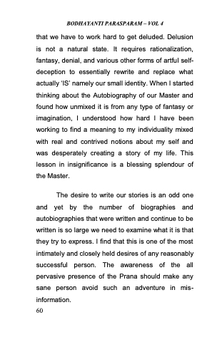that we have to work hard to get deluded. Delusion is not a natural state. It requires rationalization, fantasy, denial, and various other forms of artful self- deception to essentially rewrite and replace what actually ̳IS‘ namely our small identity. When I started thinking about the Autobiography of our Master and found how unmixed it is from any type of fantasy or imagination, I understood how hard I have been working to find a meaning to my individuality mixed with real and contrived notions about my self and was desperately creating a story of my life. This lesson in insignificance is a blessing splendour of the Master.