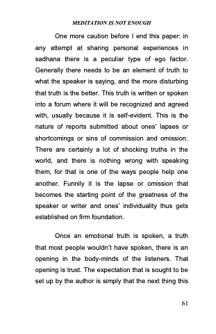 One more caution before I end this paper: in any attempt at sharing personal experiences in sadhana there is a peculiar type of ego factor. Generally there needs to be an element of truth to what the speaker is saying, and the more disturbing that truth is the better. This truth is written or spoken into a forum where it will be recognized and agreed with, usually because it is self-evident. This is the nature of reports submitted about ones‘ lapses or shortcomings or sins of commission and omission. There are certainly a lot of shocking truths in the world, and there is nothing wrong with speaking them, for that is one of the ways people help one another. Funnily it is the lapse or omission that becomes the starting point of the greatness of the speaker or writer and ones‘ individuality thus gets established on firm foundation.