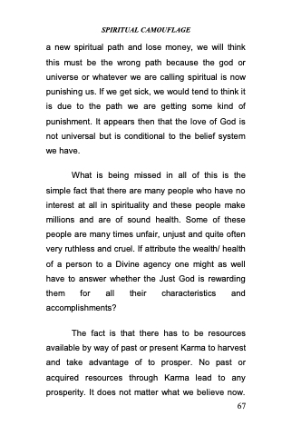 a new spiritual path and lose money, we will think this must be the wrong path because the god or universe or whatever we are calling spiritual is now punishing us. If we get sick, we would tend to think it is due to the path we are getting some kind of punishment. It appears then that the love of God is not universal but is conditional to the belief system we have.