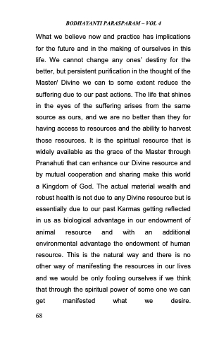 What we believe now and practice has implications for the future and in the making of ourselves in this life. We cannot change any ones‘ destiny for the better, but persistent purification in the thought of the Master/ Divine we can to some extent reduce the suffering due to our past actions. The life that shines in the eyes of the suffering arises from the same source as ours, and we are no better than they for having access to resources and the ability to harvest those resources. It is the spiritual resource that is widely available as the grace of the Master through Pranahuti that can enhance our Divine resource and by mutual cooperation and sharing make this world a Kingdom of God. The actual material wealth and robust health is not due to any Divine resource but is essentially due to our past Karmas getting reflected in us as biological advantage in our endowment of animal resource and with an additional environmental advantage the endowment of human resource. This is the natural way and there is no other way of manifesting the resources in our lives and we would be only fooling ourselves if we think that through the spiritual power of some one we can get manifested what we desire.