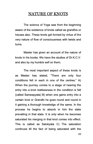 The most important aspect of these knots is as Master has stated, ―There are only four conditions felt in each in one of the centres.‖ A) When the journey comes to a stage of nearing the entry into a knot restlessness in the condition is felt (called Sameepyata) B) when one gains entry into a certain knot or Grandhi he goes round and round in it gaining a thorough knowledge of the same. In the process he begins to absorb in him the state prevailing in that state. It is only when he becomes saturated his merging in that knot comes into effect. This is called as Salokyata C) The saturation continues till the fact of being saturated with the