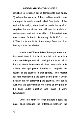 condition is forgotten called Saroopyata and finally D) Where the memory of the condition in which one is merged is totally erased called Sayujyata. If the aspirant is really determined to reach the goal of Negation the condition here will lead to a state of restlessness and with the effect of Pranahuti one may proceed further in his journey. As Dr.K.C.V. put it ―The knots could hold us away from the final destiny but for the Master.‖
