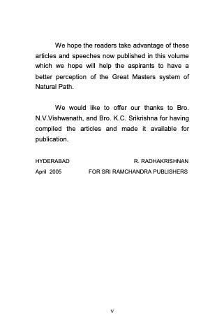 We hope the readers take advantage of these articles and speeches now published in this volume which we hope will help the aspirants to have a better perception of the Great Masters system of Natural Path.