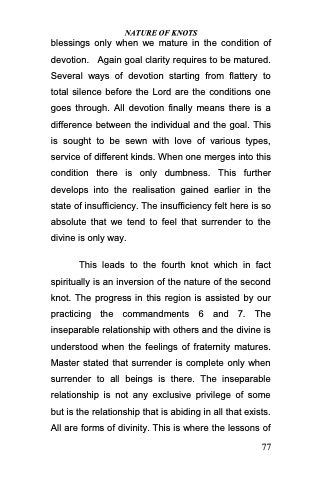 blessings only when we mature in the condition of devotion. Again goal clarity requires to be matured. Several ways of devotion starting from flattery to total silence before the Lord are the conditions one goes through. All devotion finally means there is a difference between the individual and the goal. This is sought to be sewn with love of various types, service of different kinds. When one merges into this condition there is only dumbness. This further develops into the realisation gained earlier in the state of insufficiency. The insufficiency felt here is so absolute that we tend to feel that surrender to the divine is only way.